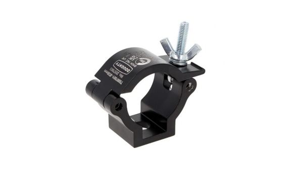 A high tensile extruded aluminium clamp that is suitable for 38mm (1.5″) diameter tubes. It has a WLL of 100Kg and is 30mm wide. Slotted to hold captive an M10 nut or bolt head. ideal for decorative trussing as it will not damage the cords. Available in polished silver or powder coated black.