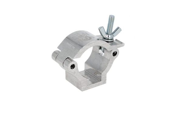 A high tensile extruded aluminium clamp that is suitable for 38mm (1.5″) diameter tubes. It has a WLL of 100Kg and is 30mm wide. Slotted to hold captive an M10 nut or bolt head. ideal for decorative trussing as it will not damage the cords. Available in polished silver or powder coated black.