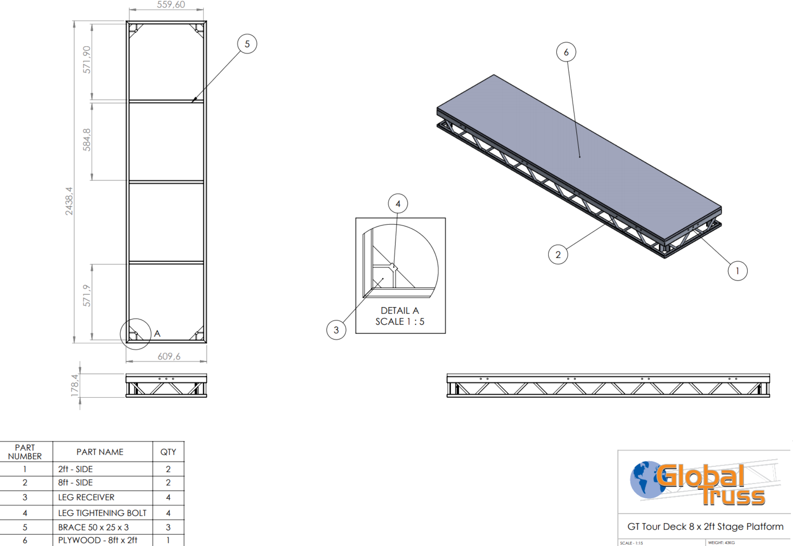 The GT Tour Deck series offers rental companies a familiar stage format conforming to industry standard dimensions. Ideally suited to the demands of touring and theatre, the Tour Deck stage system utilises standard scaffold tube size legs (48mmØ) for maximum cross compatibility. The decks are secured together using standard nuts and bolts ensuring structures remain stable during use.